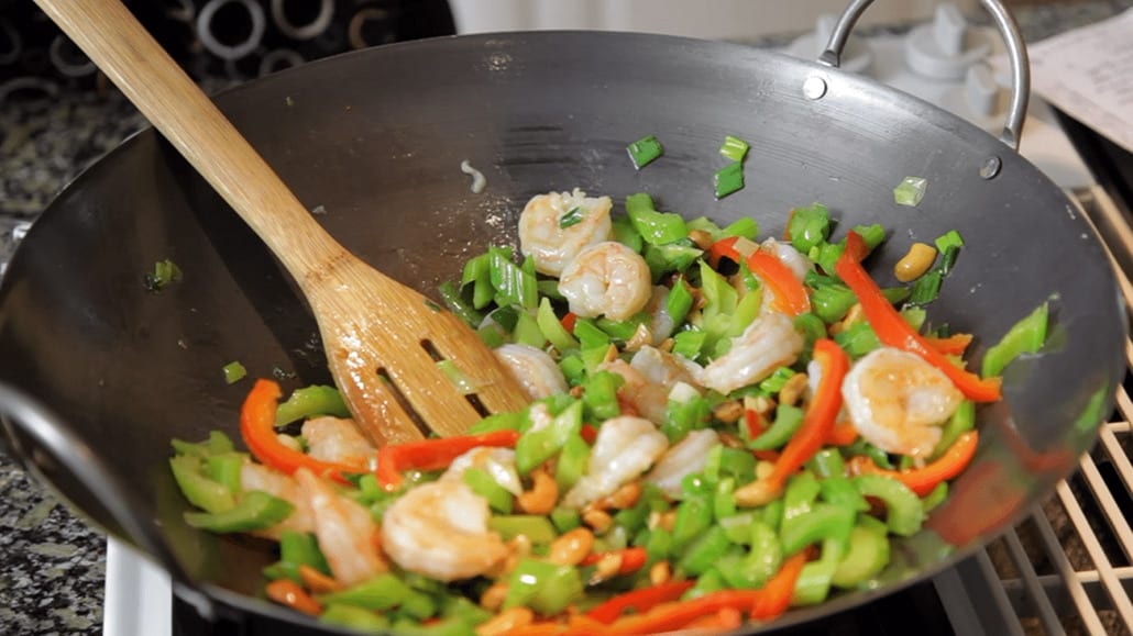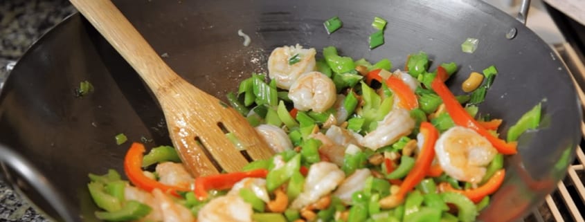 Stir-fry veggies and peeled shrimp in a wok during a “Cooking with Keli’s” video shoot.